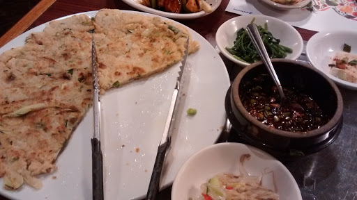 I really like this place. I love the waterwheel and the bridge at the entry - reminds me of going to fancy places when I was a child - and the rest of the decor is great too, with the wooden dividers and the bells to ring for service. And as for the food - excellent. The zucchini pancake is a must-order for us and then its just a matter of what else to make up the difference! I like all the rice dishes served in the hot stone bowls - the rice gets so delightfully crispy - and the sides (a very generous number) that come with every meal are always good too. Ive had the BBQ a few times and enjoyed it but actually think the other items on the menu are better. (Oh, and the oranges that come with your bill are a lovely end to the meal, and are unfailingly sweet. I dont know where they get them but Id like to know!).