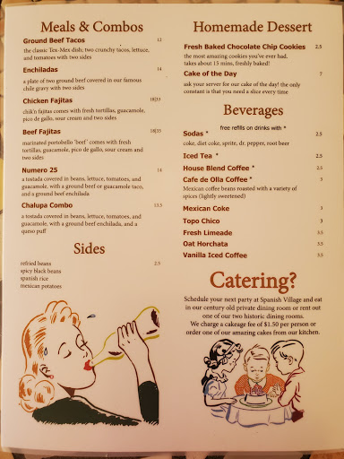 The tables at the restaurant are admirable. Im not sure how old they are but they have inset bits of tile and look really retro. The waitstaff couldnt be nicer. Spanish Village is a Houston institution and is historically significant, one of the older Mexican restaurants still in existence here. Back in the day, the combo plate that featured things such as a taco, chile con queso, a chalupa and/or guacamole salad was known as The Ladies Special or The Summer Special at many Mexican restaurants around Houston. I would recommend you forego the enchilada/tamal/rice/beans plate and stick with these summer items piled high with crisp lettuce and diced tomatoes. The selection is served as the starter on the Alfonso Pico Special: Chile Con Queso, Guacamole Salad, Beef Taco, Veracruzana and I would stop there and not go on with the hot plate of tamale/enchilada/rice/beans. That would be my recommendation for your first visit. AND...my rating of four stars is based only on the items in a Summer Special type meal.