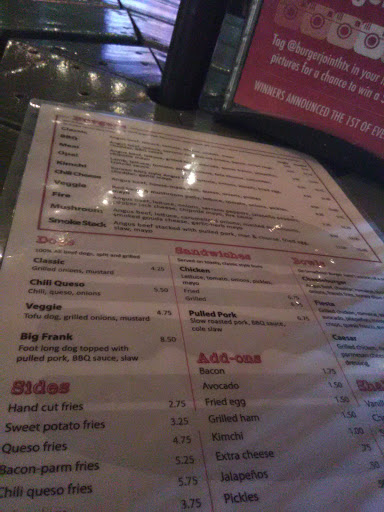 Just went for the first time, and per the lady behind the bars suggestion I ordered the turkey bacon burger with a side of mac. Was a little worried about ordering a burger outside the classic condiments and ending up with a Hubcap-esque experience, where although it was good I probably would never eat it again. However, the lady knew what she was talking about and I would eat that hipster burger any day of the week. My culinary senses arent the greatest, but I think they use real cheese in their cheese and mac, which is more than I can say for some of these other places and their use of velveta on things like chili cheese fries. I realize its not an apples to apples comparison, but just wanted to illustrate they pay attention to and dont compromise on the details. I definitely enjoy the gritty, classic burgeria atmosphere of a place like House of Fries over the is that a valet at a burger place? atmosphere of The Burger Joint, but then again Im in the make less than $30,000 living in the Heights minority who doesnt desire such fancyness. I would say that their boasting of having the best burger in town is plausible. Barring further research I would put them above Hubcap, but Im not sure yet who wins between The Burger Joint and House of Fries. But burger to burger is what counts, and if I ever want a burger after 4 pm (I guess actually being open counts too), so far The Burger Joint will be my best option.