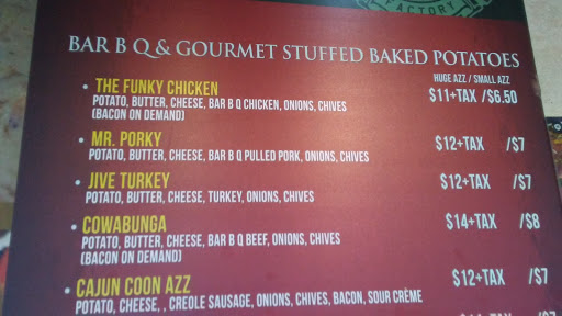 Yesterday was my very first time going to the stuffed baked potato Factory I thought that maybe if I get some simple that it will be good so I got the jive turkey and when I got it I was so excited but The Taste and the smell of the turkey was like it was its been sitting out for a long time which made me not even want it so I spend $7 on something that I wanted but couldnt eat it because of the meat being old, my suggestion to the company is to change your meat every 4 hours you should not let meat sit out for a long period of time other than that I myself would not recommend anybody to go here thank you........