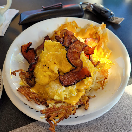 Horrible I asked for well done.... this what I got. Prior to the waitress bringing my French Toast with a long strain of BLONDE HAIR (clearly I have BLACK HAIR). She simply thought everything was so funny.... Then wanted me to pay for the meal anyway.... If u sit close in the booth u see how dirty the floor was with empty cartons etc. (Trash)... I will not eat here ever again hire clean cooks please everyone s clothes look so sloppy and dirty... ewww