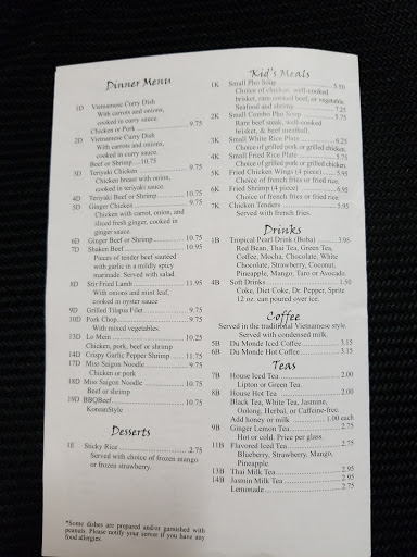 The seafood pho is great, and the siagon sandwich was good. The staff was alright. The atmosphere was very relaxing and the lighten was just right. Would recommend to all my friends.