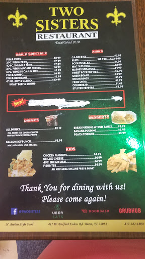 This is one of my favorite restaurants to eat at. They never fail to do their job of delivering the best cajun and creole food around. The only complaint that anyone could have about this place is that their food has so much flavor and could be almost too delicious for some (who like bland food) to enjoy. If you dont like yummy deliciousness in your mouth I would steer clear of Two Sisters restaurant.