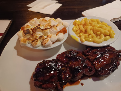 Ive seen several people compare this to a Cheddars. I agree. Ive always been pleased with my meal at Cheddars and I was happy with the food and the service at Aspen Creek too. I think this is even a bit better. In short - excellent for a chain restaurant (though Ive only ever seen one, its definitely chain). I started with a salad which was excellent - healthy green leaves with a very thick and creamy ranch. I got a ribs and steak dinner. The steak was not steak-restaurant quality (marbled and tender), but it was properly cooked, tasty and not too much gristle - a good steak for a chain restaurant. The ribs were excellent: fall off the bone tender with a perfect zingy sweet BBQ sauce. For sides I had mashed potatoes, which were actually not good - had a metallic taste, but the broccoli was quite satisfactory. My beverage was an apple cider which was fantastic! The decor, well you can see from the photos. Its a wee bit "over the top" on the outside to make a point about the theme. Inside, though, I liked: dark authentic ski lodge lighting, not overly kitsch, booth seats were quality upholstery, casually friendly waitstaff. The bathroom impressed me - individual TVs over the urinals, upscale rubbed brass pump/trough style faucets into black sinks. Overall, I was very satisfied with my meal at Aspen Creek. If I lived in the area, Id go often. I wish them well. I hope that they expand the chain to where I live.