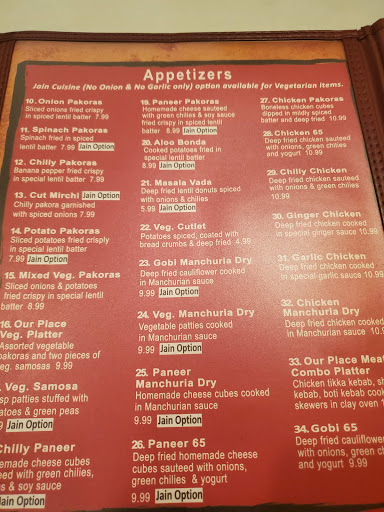 I came here for the Sunday lunch buffet. It was very authentic and overall the food was high quality. With that being said, I dont think I would recommend this to someone being introduced to Indian food for the first time. The buffet was very vegetarian heavy. At first I thought the side buffet was the vegetarian entrees. However, it turns out those were all vegetarian as well as 75% of the main buffet. There was only a small section of dishes with meat in them. My favorite Indian dish is Chicken 65, a dish which originated in Chennai India in (you guessed it) 1965. This dish was not on the buffet. There was of course Chicken Tikka Masala which is an all-time favorite among us foreigners (#1 dish in Britain). The meat seemed to be high quality but tasted dry. How do I know that a piece of chicken covered in masala sauce is dry? No clue, but I know. This is a problem Ive noticed in most Indian restaurants. Our Place really excelled at the vegetarian dishes. I personally enjoyed the dish listed as Bitter Melon which was a spicy dish that sort of tasted like cooked jalapeños with peanuts and Indian spices/flavors. I believe the real name for this dish is Khatta Karela and its definitely not for everyone (would only recommend it to those who like spicy and hardcore Indian food). I had so many dishes that its hard to name all of them but several of the vegetarian dishes surprised me and were much better than expected. There were several items here that I had not seen on other Indian food buffets before. For dessert I had the mango custard which was fine and kesari which looks like an orange mush with a small number of peanuts in it. The kesari tasted nothing like I expected. First of all, it looks like a cold dessert but it is warm like a cobbler! Its quite sweet and frankly quite good. I couldnt help myself but go back for seconds on the kesari. In terms of atmosphere I found it interesting that they had a TV playing ESPN above the buffet. I was fine with that, especially considering it is Super Bowl Sunday. Many reviews I read said that most of the clientele here is Indian. I was surprised to find most of the customers when I went were non-Indian, but I think it depends when you come. I got there at 10:55am and they had already opened early. Many of the people eating at that time appeared to be Caucasian atheists that had no church service to go to. I suspect most of the Indians start piling in during the afternoon. Service was very attentive. Im sure this is partially due to not being as busy early on a Sunday but they always filled my water immediately and each time I returned from the buffet my old plate was already removed. They also brought my check out right when I was eating dessert, so perfect timing! Overall, I liked this place. I would give it a 3.5 out of 5 if I could. This place definitely serves high quality authentic Indian cuisine. Ill probably be back at some point but will still be hunting for the ideal Indian buffet for me. BTW, the buffet price was $15.10 after tax. I suppose its more expensive on Sundays than other days.