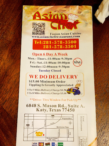 They deliver to Long Meadow Farms, which is great, theres only 1 other suitable Chinese delivery option by WalMart on Fry, and theyre worse. Ordered: Cream Cheese Crab Wonton or Puff (forgot name) Pork + Beef Fried Rice General Tsos Wonton Soup Ordering via Yelp went great BUT if you call them (I have their flyer) they offer a discount for 2 dinners. on Yelp, there is no option! So I paid extra because I was ordering from phone. Delivery was within an hour as estimated. Very polite driver. Cream cheese puffs very good, the usual if you have eaten them before. Fried rice was also usual and good Every place makes General Tsos different, and I expected a more molasse-y, sticky and fried meal but it was probably (healthier?) with a runnier sauce. Not a favorite for me. Soup smelled bad. I dont know if it was because the plastic was heating up and dissipating into soup (yes, thats a thing) but broth didnt smell fresh. BUT the wontons were delicious. Overall decent food and large portions.