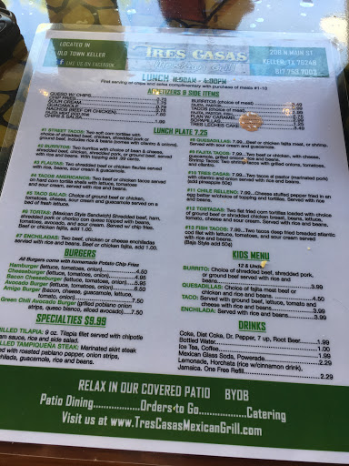 Whenever my husband and I get a chance to have a date night. We always agree that we want to eat at Tres Casa. The atmosphere is so pleasant on the patio and the food is delicious with generous portions. The servers are exceptionally friendly and accommodating. Great salsa and great food. I recommend it.