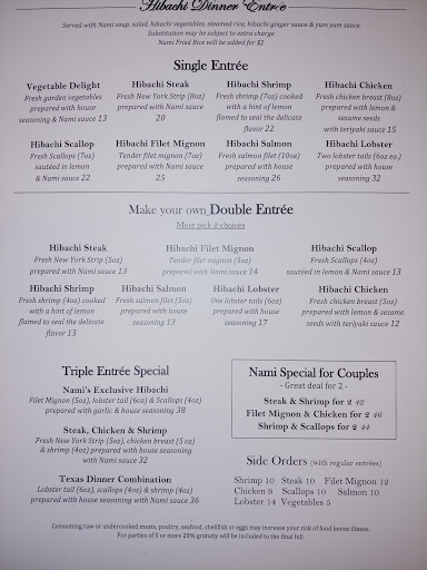 Have been to this Nami twice both times had the same Cook I think his name is Paul. He is a grumpy older man. First time I went we ordered and they were not busy it took him 45 minutes to get to our table to cook. By that time I had to go to work when I asked him to put my food in a Togo box he refused. He threw the rice back on the grill and asked me why I sat at a hibachi. Maybe if you didnt take an hour to start cooking I wouldnt have had to leave. Last night we went back for friends anniversary. Same Cook. I asked for double yum yum, dont like the ginger, and he threw(sid it over to me mad) the yum yum at me. My friend asked for the same thing and he stopped and just looked at her. Then threw (sid it to her mad as well) her yum yum at her as well. He is so rude.. Went back just for sushi a week later and sat at the tables. Food was good.. when I was done I sat waiting for my ticket for 15 minutes with empty plates. I asked the manager and he just brushed me off and 20 min later came back and told me he forgot. My waitress never came back to see if I was okay after she took my order. Will never go back. The one in belton has much better service!!!