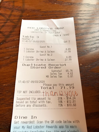Took my daughter in law who just moved to Lewisville,TX from Maryland. While eating and chit chatting, the waiter and waitress kept coming and asking if we needed a to go box. I kept telling them no, but proceeded to continue to ask. At that point, I had to ask them that we felt rushed. Then came a guy who appeared to either be a supervisor asking if everything was okay. Then we saw him whispered to one of the female waitresses. Thereafter she came back again to ask if we ready for a to go box. By the way, she wasnt our waitress at all. I usually go the Red Lobster in North Richland Hills, and thats why I choose them. Their service sucks. Please management, train them to more courteous to customers. I have never been disrespected @ any restaurant before, this was the worse. She lives in that area, never again will we visit your restaurant, and neither will recommend it to anyone else. Please do better than that to others. First impression counts as lot, and yours was a disaster.