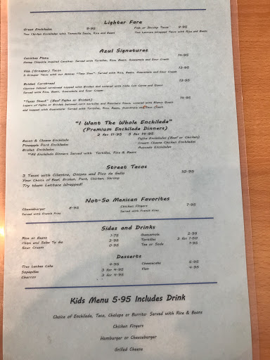 Went to Azul for the first time and it was fantastic! At the suggestion of our server, I had the Carne Asada and Enchilada. It was done perfect, and the Asada was huge. The fresh, hot, homemade tortillas were just as good too. Our server also suggested the Brisket Tacos, so my wife had those and said they were just as good although shell change to the flour tortillas next time. Then to top it off, we had Sopaipillas. They were fresh and hot with honey, with chocolate and whipped cream on the plate too. Our service was top notch and the server made for a great time too (Thank you Claudia!). Well definitely be going back again.