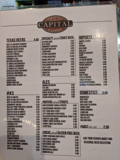 Wanted somewhere to watch the World Series with a friend without your typical college sports bar crowd. I figured I would come here since Id had capital pizza catered a few times previously. Boy was that a good decision, they have great pizza and their drink specials were pretty good. They had a special on their Texas beers the night I went... cant beat cheap Shiner.