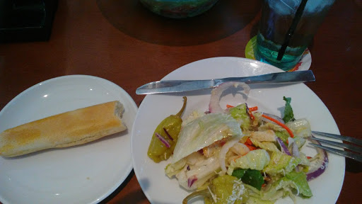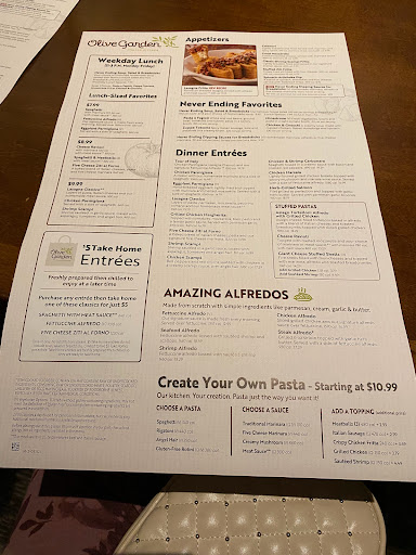 I am from San Antonio and I moved here about 8 months ago Olive Garden is mine and my familys favorite place to eat. But since moving here the Olive garden is not really good at all. In San Antonio it was perfect every time but here I have ordered the same shrimp scampi since it came out and well in 8 months I have been there 4 times and every time its messed up and made different the chicken is always over cooked and super tiny I pay 15 dollars for a dish I dont want nasty food I mean seriously they need to work on there cooks. the waiters are nice but the food is grose. Thank Goodness Im moving back to San Antonio!