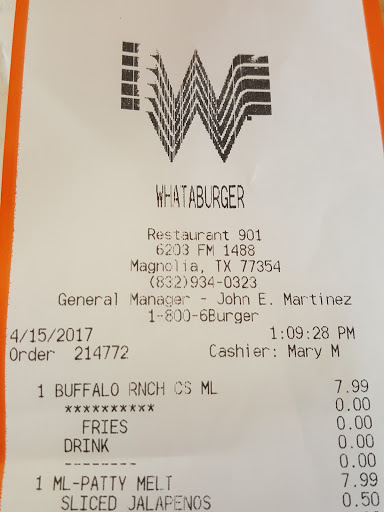 Seriously best guest Services. Not only did we get a bigger cup than we got from the Whataburger on Rayford But our food come out just from seconds of sitting down. The cashier Claudia came by twice and asked if everything was good and correct, which was very unexpected Then the Cook/ Manager came around asking if everyone was good and came to us and asked if everything tasted good and asked us if we needed a refill on our dinks then told us to have a good rest of the night Seriously Best Guest Services They are so nice and always stay occupied which is nice to see. Seriously my favorite whataburger