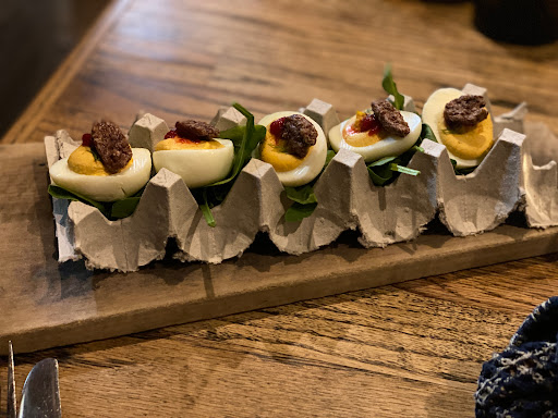 Great atmosphere, people, and of course the Food. Live music at the bar filled the venue with some relaxing tunes for a date night. Started with a Deviled Egg app made with TX pecans, pickled mustard seeds and onions on top. Amazing. Drinks. - Herman Marshal Rye Old Fashioned and house Chardonnay. Would of ordered 2 more if I wasnt driving. And then the course - Ribeye, local fed 16 ounce beauty. Cooked to perfection. Puts up a fight with any of the big steakhouses in DFW. Too much to finish and made for a great breakfast. Everything about this place was top notch, and its a staple for the downtown McKinney area. Just moved here and many more good experiences Im sure down the road!