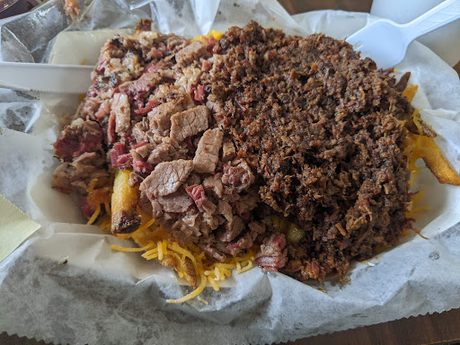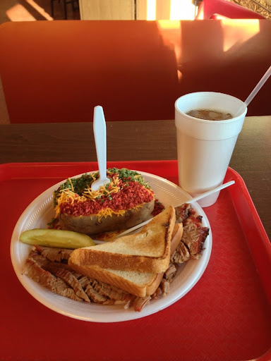 This place is my absolute favorite place to go ever for barbecue. I always get either the stuffed fries or the stuffed potato (meaning baked potato with everything on it including butter, sour cream, shredded cheese, bacon bits, chives; and a meat. I always get the brisket. My stomachs growling just thinking about it.) and the meat is always cooked PERFECTLY. The staff is always really friendly, too, and while Im not the type to expect special treatment or for people to remember me just because I go once or twice a month, the people there do recognize me occasionally and know just how much I love their food. Its just a tad on the pricey side, but not much more than your average fast food large combo, and it is SO worth every single penny.