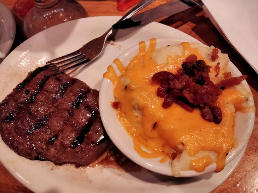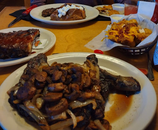Extremely busy. Parking lot was full and hard to find a spot. Crowded entrance and side walk. Despite this, our party of 4 were seated immediately. Server was friendly, helpful, and attentive. Loud environment, can be hard to converse. The fried pickle appetizer is sooo good. For my meal I had the steak and shrimp. Was offered 2 sides, but only ordered the loaded sweet potato. The steak was perfect. Tender, juicy. They offer for you to pick your own cut when you first enter. The shrimp were grilled and tasted fresh and tender, not overcooked. The sweet potato is the perfect side to the savory meats with this dish. This is a great place for dinner and friends, just a little loud for catching up with someone you havent seen in a while.