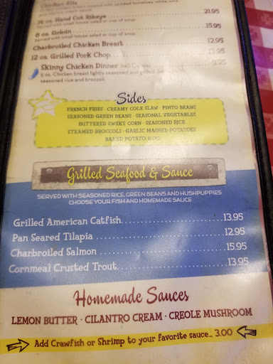 Love the environment. Servers were great also. The 2 star rating is due to the unwillingness to acomodate my shell fish allergy. I am a big fan of fried cat fish. They advertise that their cat fish is the best. Excited about this so I order the catfish and mention my allergy. They state that they fry it with their shell fish and will not cook it separate. Truly disappointing only place I have ever been to that refused to help me. Though its not recommended I had to try a small piece to satisfy my urge and curiosity of this famous fried catfish. Sad to report it but there was nothing special about the fish or onion rings. Two hours north of here there is a little place that claims to be home of the "Big O". If you want good fish and onion rings head that way.