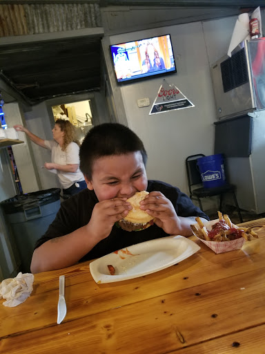 My husband and I took his grandmother here after a morning of golf. We are from out of town and had already checked out of our hotel and I called ahead and made sure we could have our dogs on the patio. When we got there, the waitress showed us a gate we could go through and brought a pitcher of water for us and the animals. The patio was clean and nicely decorated - it would be a nice place for supper and drinks for sure! Im not sure why it wasnt more packed at 1pm because our food was great. My husband and I both ordered burgers on sourdough and jalapeno sourdough and they were big and juicy and piled high with bacon. His grandmother ordered tacos and she ate all three! I did dock one star for the bathroom. The back of the toilet was literally broken in half and taped together, and the sink was stained/rusted. I know its a bar though and bars arent known for having stellar bathrooms anyway.