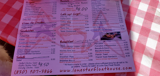 Want a great place to get a great burger? Then head on out to New Braunfels and take a scenic ride out on River Road along the beautiful Guadalupe river. Take in some great views while you journey past majestic cypress trees that line the river. Once you drive over the second crossing, keep your eyes peeled for a hidden gem called The Lonestar Floathouse. Truly the best kept secret of the area! The greatest burger on earth is served here! Truly remarkable and delicious. Great atmosphere too! They have a big deck overlooking the river and also have live music on occasion. Its definitely a day trip you have to make! Go get your grub on and come hungry. You will not be disappointed!