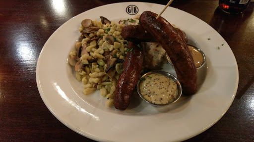 First visiting this place which is right across from RA Sushi in Shops of Legacy in Plano. We went in around 3 pm and the place wasnt too full. We were greeted and seated promptly. The decor is okay, its a restaurant and brewery. Our server was very helpful, explained the beers on tap and what the menu was. Told us a little about the place and let us know they have tours as well. Their menu options has some German inspired stuff but not many. Their beer selection is awesome and the ones they brew on site sounds great. I ordered the Hefewiezen and Golden Export which were great. The taste was crisp and aromas good and pair well with my plate. For a starter we ordered the garlic fries and southwest egg rolls and were very impressed. The fries were very crispy and the garlic was plentiful and the fries soaked in it. It was great but beware of the breath later. The egg rolls were nice, full of ingredients and fried just enough. Better than Cheesecake factory ones for sure. We ordered the Traditional Sausage Platter which was delicious and the GB Beer Mushroom Chicken. The food flavor was good but not great. The potato croquettes were a little burned and once you dig in there isnt much flavor. That is why you have two sauces to try and were nice but I am not a big sauce person, I prefer to taste the actual food. The chicken was actually schnitzel but the flavor was lacking. Once you try the sauce then you get a great taste but alone, nothing to write home about. The asparagus were surprisingly good, they were not under or over cooked. All-in-all a great place to visit and hangout with friends. Bring your buds over to have some great beer. The bar looked very nice when we walked in. Some food was lacking flavor but I guess it depends on the plate you choose. I think you wont be disappointed. Ohh, and they have growlers to take home. Grab one of those next time for sure.