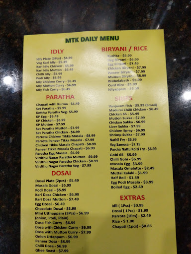 Mixed reviews for me in this place after a handful of visits. Would like to share my experience with you all. 1) the one dish that consistently liked by me and my wife is their idly, they are soft, they are fresh, hot. The chutney and sambhar is also very good and the overall combination is very tasty. Their idly plate consists of 3 idlis and costs ~3$ compared to Sarvanna bhavans 6$ for 2 idly. Me and my wife often visit them in the evening for the idly plate. 5 stars for it. 2) their lunch buffet is total bang for the buck. Try it out once if you havent. 4 stars for it considering the cost, 3 stars for the taste. 3) their chicken 65, fried chicken is tasty too. 4) their kothu parata is not as tasty as Kumars , I feel the reason is because of the raitha and the curry, MTKs raitha always smells of rotten onions and takes away the whole taste . 4 stars for kothu parata, but 2 stars for their raitha and curry. 5) today I took their special Bhai kadai biryani, it was 9.5$, very costly considering that the quality of rice is not basmati or jeera and I didnt get any mutton on it. On the contrary bawarchis biryani costs you 12$ , they give 1.5x times than MTK and ample number of mutton pieces. I felt it was very costly and not worth the money I paid. 2 stars for it. 6) their mango lassi was very good.