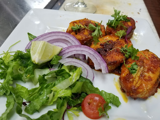 I had a really good meal here with some great friends last night. We found the place via the Yelp app, and were drawn by the great reviews which, as it turns out, are spot on. After being seated, we perused the menu, which is a simple two page affair that lets you hone in on something without getting analysis paralysis. We decided on gobi/corn manchurian and chicken lolipops for starters, both requested (and delivered) medium spicy. The manchurian was delicious, very crispy with a perfect breading and very nice, spicy flavor. The texture of the cauliflower was just right, not too crispy and not mushy. Corn seemed less prominent in the mix, but was nice as well. The chicken was crispy on the outside yet moist on the inside, and if there was a knock at all, the drummers could have been a little meatier For the main courses, we chose chicken biryani, boneless lamb korma, and Gongura goat curry. The biryani had a nice. fluffy, and fragrant rice, with a good sized portion of bone-in chicken beneath. Accompanying raita and curry sauces were delicious, and went well with the garlic naan (very garlicky, in a good way) and green chili naan we selected. The korma was slightly sweet yet spicy, with a thick, great flavored sauce that really clung well to the lamb pieces. The lamb itself was tender, juicy, and had a delicate flavor that definitely said "lamb" and not "mutton". Goat curry was even better, with a dark brown sauce that had a very good spice, and while there were some bone-in pieces, most of it was boneless, which made it easier to eat. Overall, our dishes here were outstanding. Everything tasted great, the presentation was good, and the meats were all very good quality. This is definitely a good place to sample fine Indian cuisine!