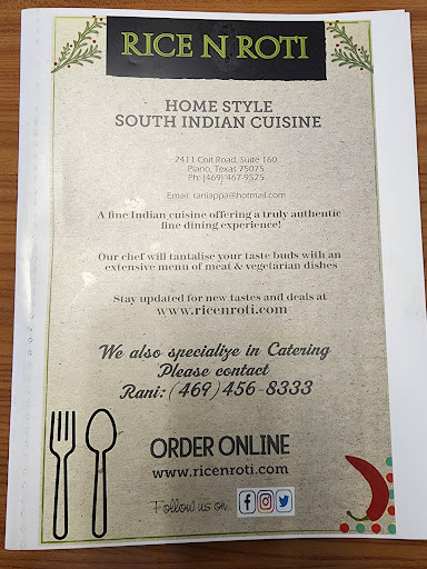 Excellent catering service and food from RiceNRoti for a dance event organized by me recently. It was boxed to-go vegetarian dinner for about 200 guests and Rani from the restaurant was very courteous in understanding our requirements, discussing the options and even providing sample food to taste before placing the order. They delivered the food to the location on time. In addition we had arranged for snacks and coffee/tea too prior to the event that was also done well. Overall very happy with the service. Rama Krishnan Plano, TX