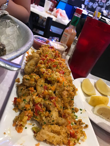 Order: Calamari and Hushpuppies appetizer; Kitchen Sink#1 1lb Shrimp & 2 corn. Kitchen Sink#2 1lb Shrimp, 2 corn, potatoes & sausage. M: The Calamari is hands down the BEST calamari since moving to Texas. That’s including Pappadeaux! We didn’t have to add any seasoning at all, which came as a surprise and it was perfectly cooked. The hushpuppies were handmade and flavorful. The Kitchen Sink#1 was great. The flavors of the garlic, Cajon and lemon pepper all hit together nicely. C: The Calamari is excellent, had the exact right amount of seasoning. You get a very nice portion size for sharing and it was cooked to perfection. Kitchen Sink#2 The flavors went well with the ingredients. Everything was cooked right and seasoned just right. The sausage is definitely worth ordering! Has great flavor. If I could eat this everyday I would. 7 Star Rating We came around 3 o’clock on a Monday. Not a hard place to spot with the MONSTER TRUCK sitting out front. The place was pretty empty, but fully staffed. The staff was alive and fully explained everything to. They had a lot of TV’s inside and a bar area, as well as general seating. Being a “newbie” we didn’t know how messy this place could be! They provide you gloves and put a bib on you so everyone looks silly together! The food tastes so good, you don’t care about any of that. The Best Calamari!! Great Service!! Great Flavors!! Never a dull Moment.