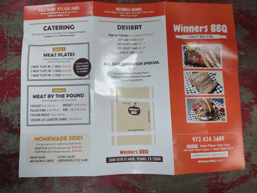 I am from Kansas City Missouri and have lived in Dallas for 3 years. Im all about good meat and Barbecue is my favorite type of food so i know good barbecue when i get it. I was impressed with Winners quality of food. Finally got the good seasoning and my preferred style of potatoe salad and baked beans... I have searched North and South Dallas for 3 years. I would have given 5 stars if it were not for the quantity recieved when attempting to feed a family...or simply just me and my husband. I love the sliced brisket (best ever) but the quantity is minimal and not worth the purchase if you want to spend less than $30.00. Also, im used to Gates and Oklahoma Joes in KC so again, i feel like I am receiving kids portions when i get these little slices of sausage in a container. Should consider slicing it down the middle for a better hearty appearance to a true "foodie." Im only 125 pds but i could not come here if really hungry for a hearty serving of ribs and brisket which i eat weekly. I will continue to slide in when I am solo and want to curve my craving for good BBQ. Winners is #1 so far but still searching for fulfillment. I want meat not a baked potato!