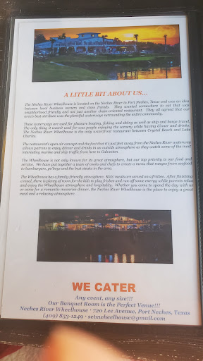 If anything ever finds us in the area and were craving seafood, The Wheelhouse is our top pick. This place is almost always full of customers, and a meal there makes compelling evidence as to why. The wait staff is attentive, nice, and fast, the food is great especially since its so different from whats available in the area, the venue itself is a great view of an otherwise ugly river, and the prices are agreeable. If youre in Port Neches and want seafood, turn your wheel towards The Wheelhouse and escape your traditional notions of a seafood dish.