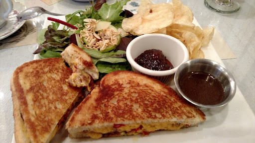 My go to tea-room in Dallas-Richardson, TX. Menu is outstanding...I go back and forth between the Gold Star plate (which is not mention this way on menu but is the classic trio of chicken salad, broccoli-raisin salad and strawberry Jello salad with a pretzel base and whipped cream topping) and my other favorite Some Like it Hot grilled pimento cheese sandwich( with pecans, candied jalapenos and strawberry jam...thats right...strawberry jam). All the girls from young to old love it and men do too!
