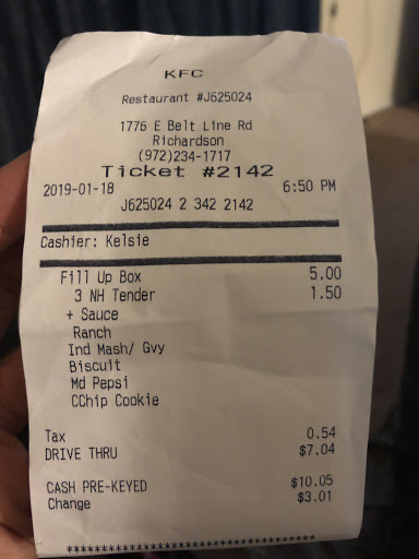 Two out of three times, the chicken is not fit for comfortable consumption. It takes way too long to order and get food. I am done with KFC at this location.