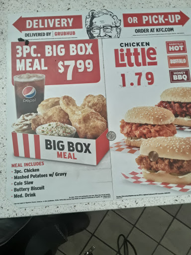 Crack heads in the dinning area making drug deals on the KFC company phone LOUDLY while were eating. Pacing back and forth scaring the kids we had with us. Cole Slaw smelled like it was spoiled. Biscuits burned. Never coming back. Just a trashy KFC. The only thing nice were the employees. Kind folk and service was very good.