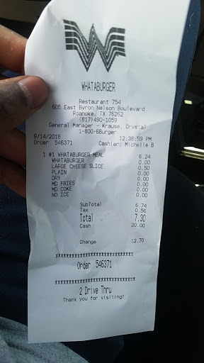 Very nice food, reasonable prices. Whataburger is a nice fast food stop if your hungry. Great melts and burgers. French fries are cooked to a good extent, would recommend if your in the area and in the mood for American style food and hamburgers.