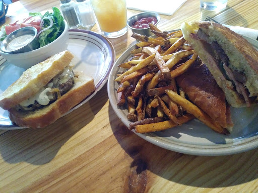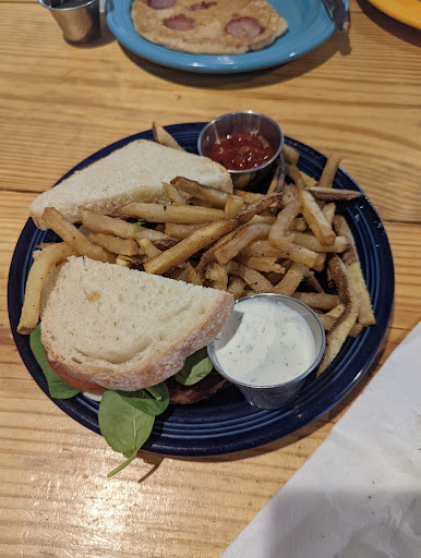 This was my first visit. We went to lunch for the grand opening of their patio. They advertised $4 burgers and $3 patio pounders. So I went with my husband and two teenagers to get a cheap burger and hang out on the patio. We went in and the hostess seated us under 10 minutes. She seated us inside because the patio is more the size of a porch with very limited seating. Thats fine, the special started at noon and we got there at 12:30. So seated in under 10 minutes which was great! It went slightly down hill from there. Our waitress was nice enough but not very informative. She explained that they do not have fountain drinks, only bottled drinks. No bueno. So we just went with water. We asked for the burger special but if we wanted one we either needed to sit on the patio or go back to the patio and order. Not sure why this wasnt made more clear as we wanted to eat and hang out. So we decided to share a plate between the 4 of us. My kids shared the BLT and the bread was toasted so hard that it cut the roof of their mouths. My husband and I shared the cheese steak sandwich which was good but the bread to meat/veggie ratio was terrible. The bread had a great flavor and so did the meat. However, if you want cheese then its extra. Say what? Again, the flavor was great but there was not enough meat compared to the bread and maybe 5 strips of bell pepper. Sides were chips (only plain wavy offered), fruit or salad. No fries? It took longer to get our food than to be seated. Almost 20 minutes wait. We got our waters and that was it until our food arrived. Our waitress did not come back by until after someone else brought us our food. It would have been nice to have her stop by at least once to say our food would be out soon or to refill our water. While we were eating we did need refills. Our waitress stopped by and said that she would get us a refill. Ten minutes passed and still no refill. She had stopped by several other tables and then went back to the staff area and was just chatting. The water pitcher was right in front of her. This was another problem. The staff spent more time in the staff area than on the floor. They were friendly enough but didnt really work. Still needing water and flagging not working, we caught the hostess as she walked by and asked for water. She brought it right over. We paid and left and decided not to come back for the concert this afternoon. Its too bad because I love hip, little spots with character. Customer service definitely needs to be taught and specials need to be more clear. The people behind the counter should come out and say hi, be friendly. Also, another little annoyance, there was music in the background but the only speaker was in the staff area.