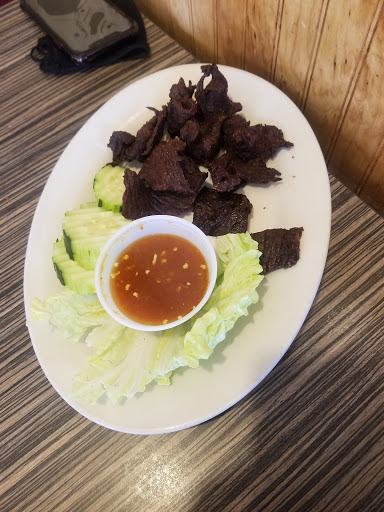 Dinner for four on a Saturday. Attentive and joyful hostess and server. Hot tea was hot (without having to ask that the water be hot). Spring rolls appeared a tad over golden brown but were visually pleasing and oh so very flavorful. The chicken rice noodle soup was flavorful, served temperature hot, and mildly spicy hot. The pepper steak was flavorful; and the beef was abundant and tender. Nice chunks of bell pepper and onion. The dark sauce was a thin sauce, not greasy. The num prig pao with chicken and extra veggies was a little less flavorful - likely due to the added moisture from the extra veggies. I asked for extra veggies, which were tender and not soggy. The many pieces of chicken were tender and the mild chili garlic sauce was also thin, not greasy. I love thin sauces. Delicious and comfortable experience at a very reasonable price. Will definitely dine here again.
