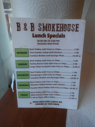 Wow! I dont know where to start. The service was spectacular. The cashier was wonderful and deserves a raise because she is the face of the restaurant and I wouldnt be saying how great the service was without her. The lemonade was fresh and perfectly sweetened. I had the turkey, brisket, and pork ribs trio. The turkey was very tasty and moist with a great smoke flavor. The brisket was marbled (my choice) not as much smoke flavor here stick with the ribs. The brisket was a little too much like a beef roast. The ribs were fantastic. They were moist, meaty and full of flavor. They may have been some of the best ribs Ive ever eaten. I am comparing these ribs to even my own home smoked ribs. Lets just say if this place was close to my home. I wouldnt go through the trouble of making them at home anymore. The green beans were actually green. Look at the pictures. Most places get them out of a can or theyve cooked them down for a long time. I highly recommend B & B Smokehouse. Go for the smiles. Stay for the food. Excellent!