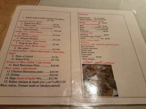 The atmosphere is friendly and comfortable. The food is authentic and tasty. Everyone is welcomed like family. Fresh hot Iraqi bread is served with your meal. Portion sizes are large and filling. The kabobs are flavorful - chicken, beef or lamb. The tikki chicken is one of my favorites. The fish and rice is a popular dish. The vegetable soup is savory and the eggplant complements the tomatoes and other vegetables.