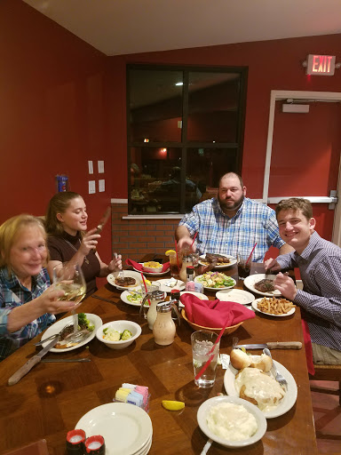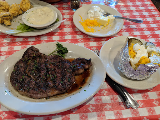 Came here based on the many 4 star reviews, and was more than a little disappointed. Maybe those reviewers are comparing it to Golden Coral? Think of a western themed, slightly down-market Outback Steakhouse and youll be close. First, ignore the salad. A massive pile of cold, flavorless iceberg topped with equally flavorless croutons and one ice cold cherry tomato (which was still the best part of the bowl). The blue cheese dressing was pretty much tasteless, too. The "baked" potato was cooked in foil, so it was steamed more than baked. Dont look for a crispy skin here. On the bright side, they give you lots of toppings. The steaks were OK, but far from premium, and way overpriced for what they are. They claim to cook over mesquite and charcoal, but the mesquite flavor minimal. Maybe they should use more wood and less charcoal. They werent bad, but given the cheap atmosphere, mediocre sides, and middling cuts of meat, the meal was overpriced by at least 50%