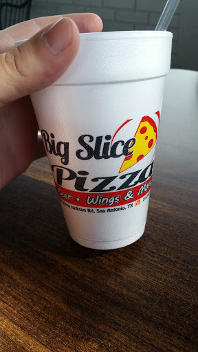 This place has come a long way since its changed mgt in 2013. The crust of the pizza keeps my wife and I coming back, its the best weve found in San Antonio for the money & proximity to our house. (Dough and Fralos are great but theyre expensive and far!) Big Slice has great dough for the dough ($), making for a great pizza. Toppings are also good with generous portions as are the salads. My personal favorite is the spinach salad, which comes with hard boiled eggs and fresh mushrooms (= yum). The inside decor is simple and not showy if your taking friends, but they do serve beer and have a couple of flat screens if you need to watch the game some place. 5 stars for the pizza 3 stars for the inside decor - could be better but it is what it is!!