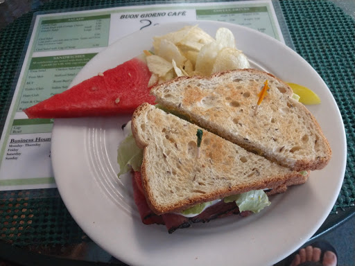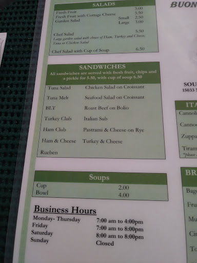 I visited Buon Giorno mid week for lunch with my daughter and my sister and her son. The service was quick. We ordered a sandwich and soup. The soup tasted like it came out of a can but the sandwich was good. The almond coffee was delicious and much cheaper than Starbucks. I was planning to visit frequently just for coffee alone ...until the owner came over and spoke to my daughter. She was eating cheerios, and dropping them on the floor occasionally, as every one year old does. The owner was clearly irritated by it and asked my daughter if she was going to clean it up... Shes one! :/ So all in all, coffee is great, but this is definitely not a kid friendly restaurant.