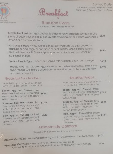 Just tried The Courtyard Cafe for breakfast; have to say it was very good! Wait staff was prompt and courteous plus the coffee was great! My son and I can drink several pots, and our waitress kept us well stocked. Cant wait to bring my wife and daughter - they just have to get up earlier!