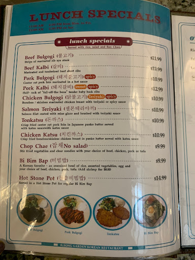 Dont come here if you want authentic Korean food. I came here with my family and we ordered a beef bulgolgi, pork bulgolgi, and beef kalbi along with a spicy seafood soup to share and were disappointed with pretty much everything. The first thing that is strikingly apparent is how each of our food looked almost exactly alike, but with a different sauce. The pork bulgolgi was the most disappointing of all of our orders. It was a sad piece of pork drenched with Korean hot pepper paste that you could get in the ethnic aisle of your supermarket. The spicy soft tofu and seafood soup was thin and watered down. Lastly, when you go to a Korean restaurant, you are usually greeted with a barrage of side dishes. Sadly Ilsong Garden gives you only a handful, all of which were lackluster. Do not come here if you want to eat true Korean food nor a good deal. It lacks the flavors, the quality, and the appearance that true Korean food hold for a price that is more of a joke than an indicator of what youll be getting in return.