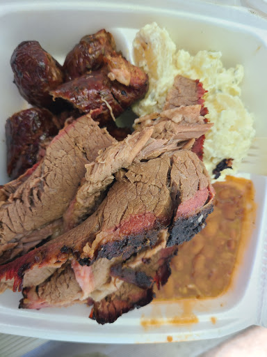 2 meat plate is a ton of food for 9.50. The sausage is moist and a little spicy. Brisket had really great bark. Everyone is friendly. Worth the trip.