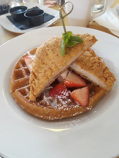 Service was mediocre (hotesses, did not acknowledge us until after we had been standing there awkwardly; waitress, had to be told by a co-worker that we had not been helped). Food was terrible. My waffles tasted okay on the first bite and then increasingly tasted like cardboard- the wierdest experience. This was essentially how all the food was: the more you chewed, the more disappointed you became. I dont know what disappointed me more- the watery latte that had no flavor or the food...that had no flavor. I dont understand how people can justify paying for this mediocrity? There was one waitress that knew what she was doing (the one who made sure we were helped). She and the other hard workers at this establishment (as Im sure there are other hard workers) are the only justifiable reason for this place even deserving one star. Long story short? IHOP is a better value for your money.