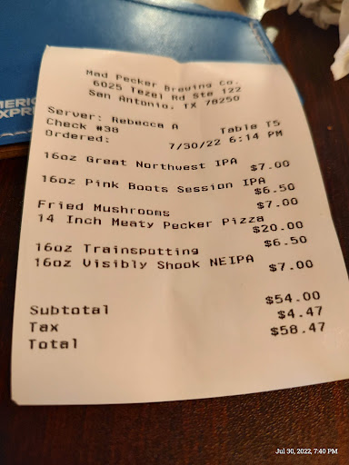 Our family had an awesome experience at the Madpecker. The gang there was super friendly. They also have a terrific selection of excellent beers. Highly recommend stopping in for a pint when you get the chance. The homemade pizza was topping on the cake as well