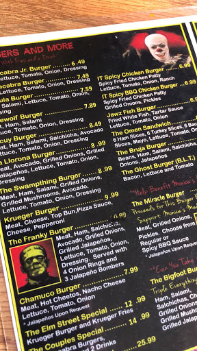 The Burgers are Awesome there many different choices and different styles with different names like Dracula the Creature from the Lost Lagoon and San Antonio folklore Legends as the chupacabra and the Llorona