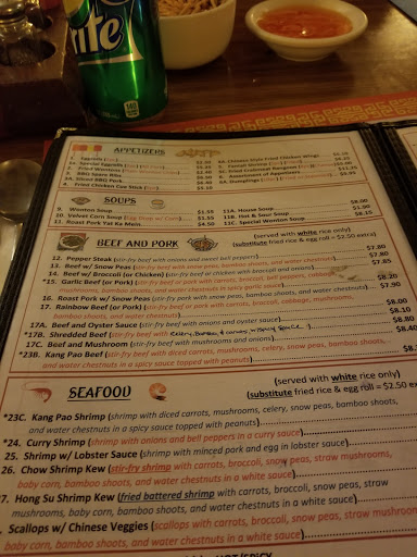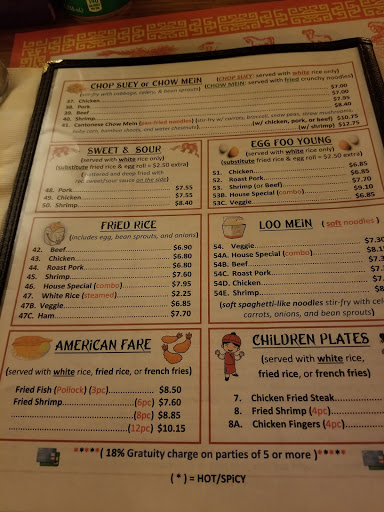 Ive been going here for many years and the food is absolutely wonderful! My entire family loves it when I order an assortment of things and we make our own buffet style dinner at home on the kitchen island. Top favorites are definitely the pork fried rice (amazing stuff!!), egg drop soup (good thickness), kang pao beef/chick/etc.., sesame chicken (not too sweet), veggie egg foo young (has thick gravy), lo mein (packed w/ veggies), and if youre in the mood for something very mild you can always have the house soup (a mix of all the veggies and meats w/ noodles). My son doesnt care for chinese food, so Im grateful I can order him fried fish (or shrimp) with french fries (plus there is a great burger joint next door I can pick up a burger from in case he doesnt want that).