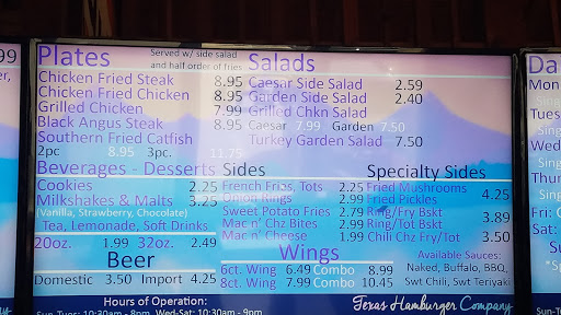Fried catfish was excellent as were the onion rings. Service at the counter left a lot to be desired. Person taking orders was gruff and hard to understand. And, yes, I was born and raised right here in San Antonio and have lived in Texas all my life, so it wasnt the Texas drawl... He just mumbled and seemed irritated to be taking orders. Needed a personality work over. Surprisingly, even though the name on the place says its for hamburgers, my wifes cheeseburger had very little flavor. I tried the meat and cheese by itself, and found it to have barely any seasoning at all, which left the burger tasting a lot like what you would get from McDonalds! They should at least add a little salt and pepper to their hamburger meat! On the other hand, the breading on the catfish had excellent seasoning! The catfish was fresh, super hot, and delicious... But this is not Texas Catfish Company! Im only giving three stars due to the catfish and onion rings. If all we had ordered was cheeseburgers and fries. This would be a one star review taking into account the attitude of the guy at the cash register taking orders!