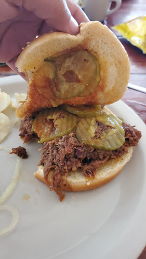 Great atmosphere, laid back and relaxed. It can get a bit loud in here, but not to a point of screaming to be heard. The wait staff were all friendly and prompt. We had the brisket stuffed potato (Im from Idaho and trust me, I know my potatoes...this is a DEFINITE winner!!) and some ribs and turkey. The potato was bigger than my husbands hand, and the potato salad and pinto bean soup tasted fresh and homemade. Everything we had, including the sides of potato salad, pinto bean soup and coleslaw was delicious!! We could not get enough and ate slow just to savor it all. I was slightly disappointed that the "smoked turkey breast" was like shaved lunch meat, but it was very tasty and I enjoyed it...I was just expecting something like a small piece of breast meat or something I guess. I also wish they served more bread with the meal, but no biggie. Definite recommendation and 100% approval rate from us! They also sell souvenir t-shirts and glasses, and have a "backyard" that has trees, grass, old tractors and some dry lots with horses and long horns that you can leisurely stroll and check out...what fun!